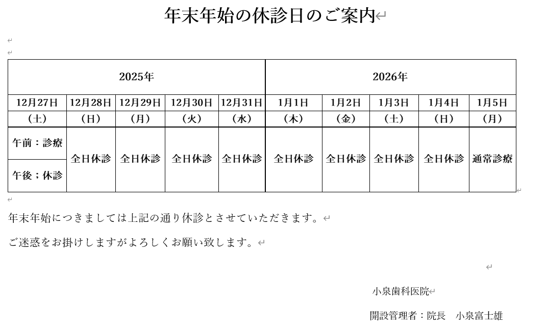 年末年始の休業のお知らせ