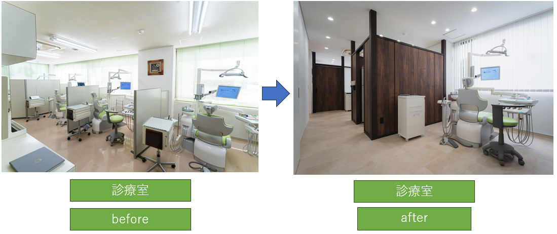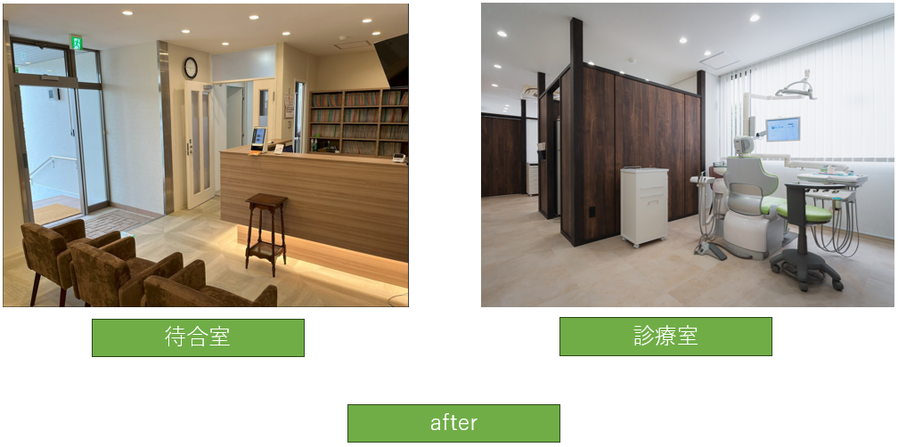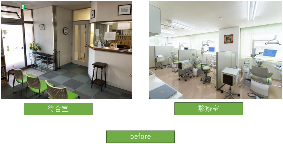 上記の画像が今までの歯科医院でした。待合室で靴を脱いで診察室に入っていく昔ながらの歯医者さんのスタイルでした。靴を脱いでもらうのは患者さんとしては手間ですがこちらとしては院内が清潔に保ちやすかったため割と好きなスタイルでしたが患者さんが高齢化していき靴を脱ぐのが大変とのお声をよく伺っていたので世代交代のタイミングで土足で治療を受けられる歯医者に変更していこうと考えました。