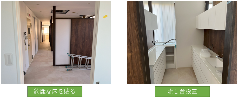 床を綺麗に貼って流し台を設置していよいよ大詰めです。