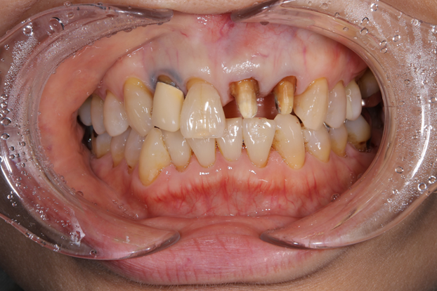 すでに被せ物を除去したあとの画像になりますが、歯を削ったところには保険のプラスチックの被せ物が入っていました。経年劣化でかなり黒ずんで見た目を悪くしていました。